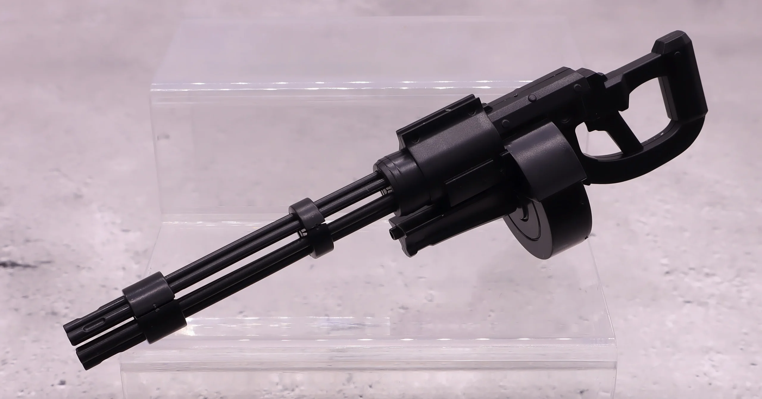 腕の保持力がメチャ強なので、こんな無茶なガトリングガンの持ち方でも腕が垂れ下がってきません
