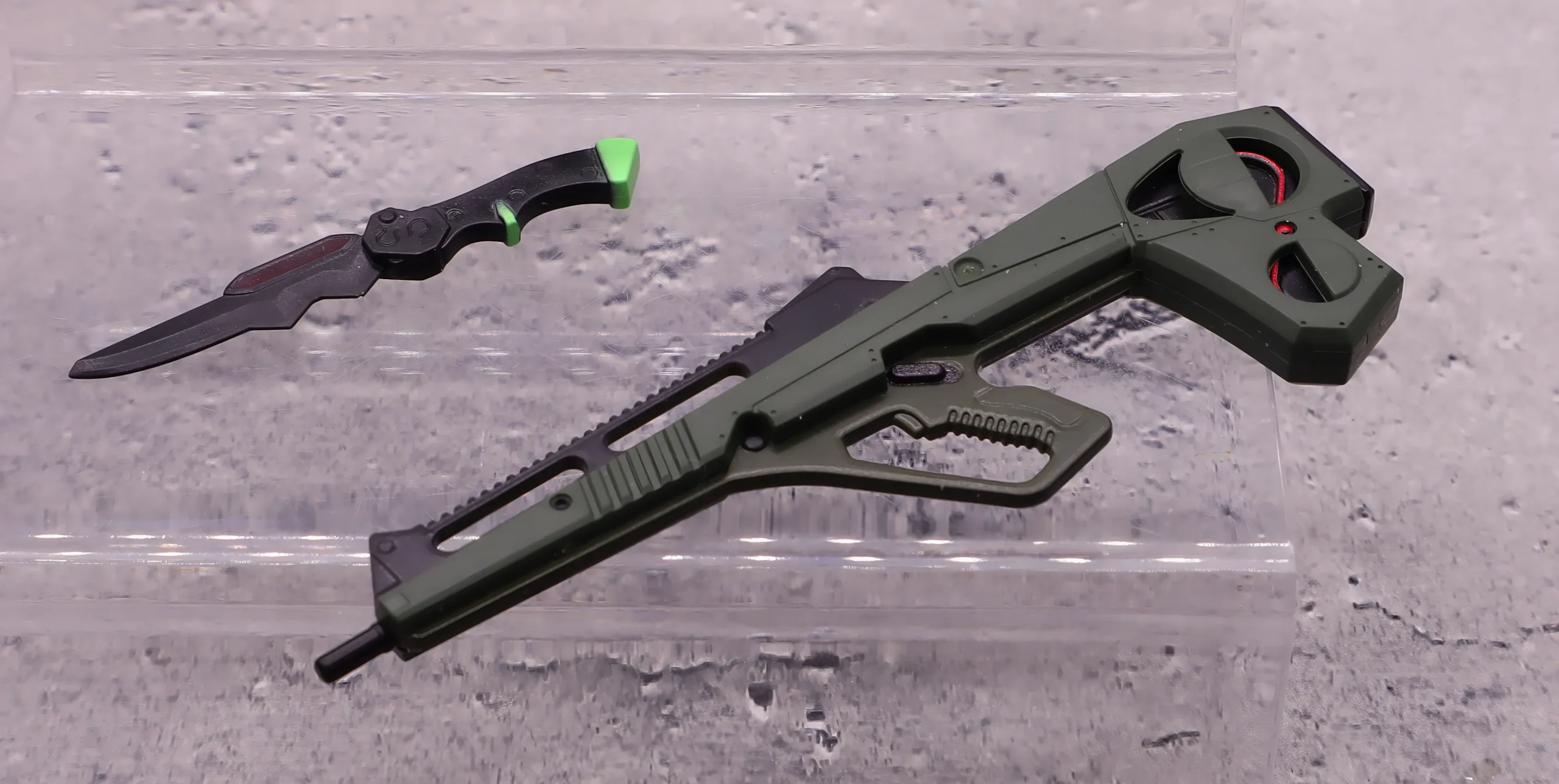 プログレッシブナイフは柄の部分は刃の部分だけ黒い成型色なので、ここだけシルバーで塗装すると良いかもしれません、パレットライフルは3パーツという単純な構成ながらも塗装パーツと上記のツヤ消しパーツのおかげで色分け/質感ともに凄く良い出来