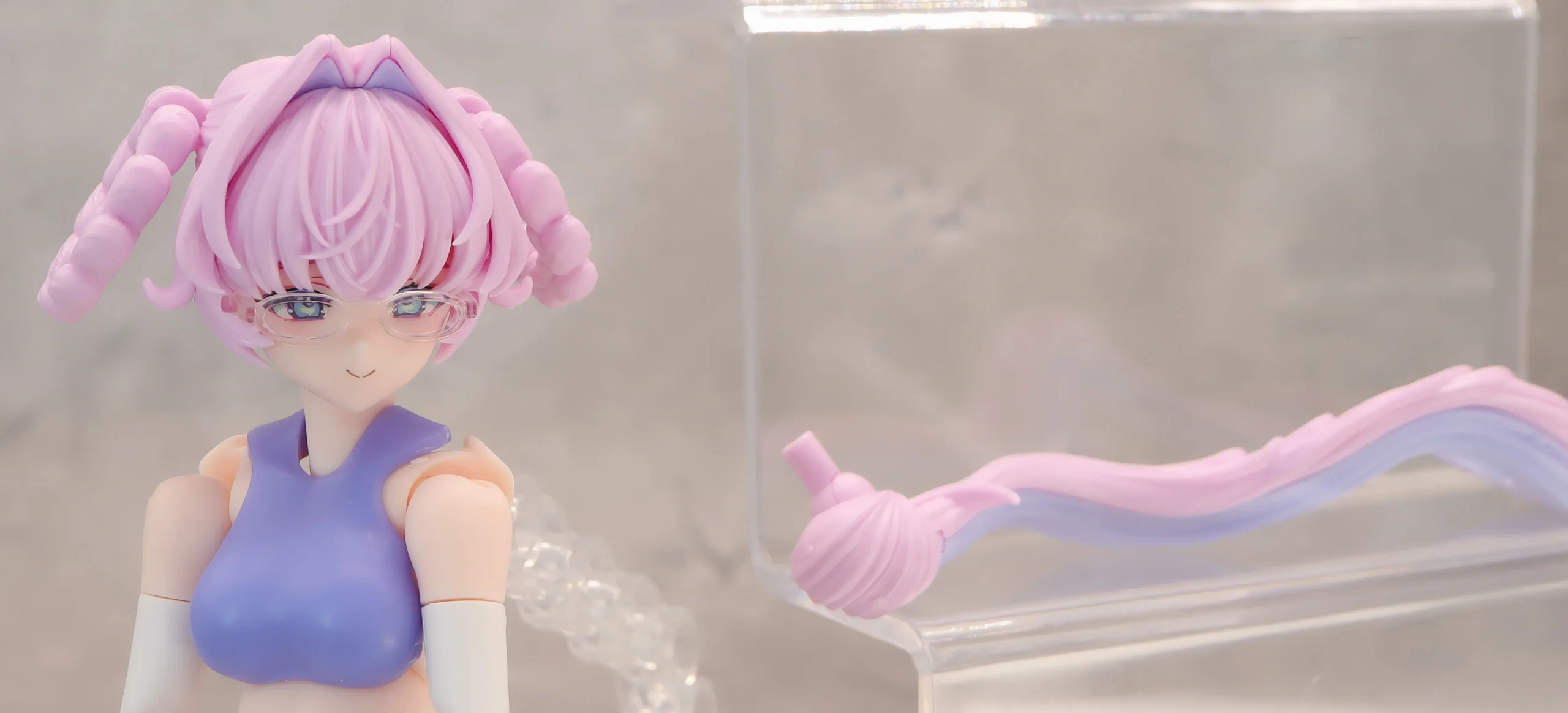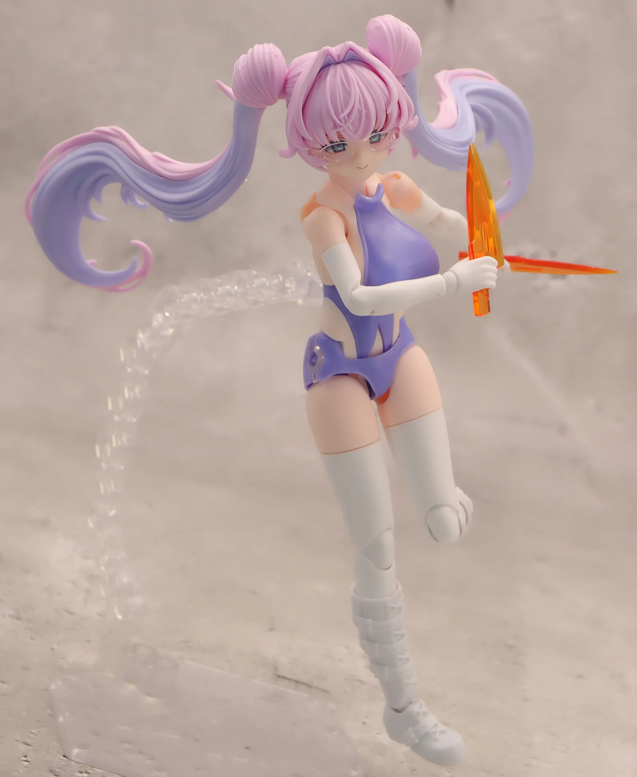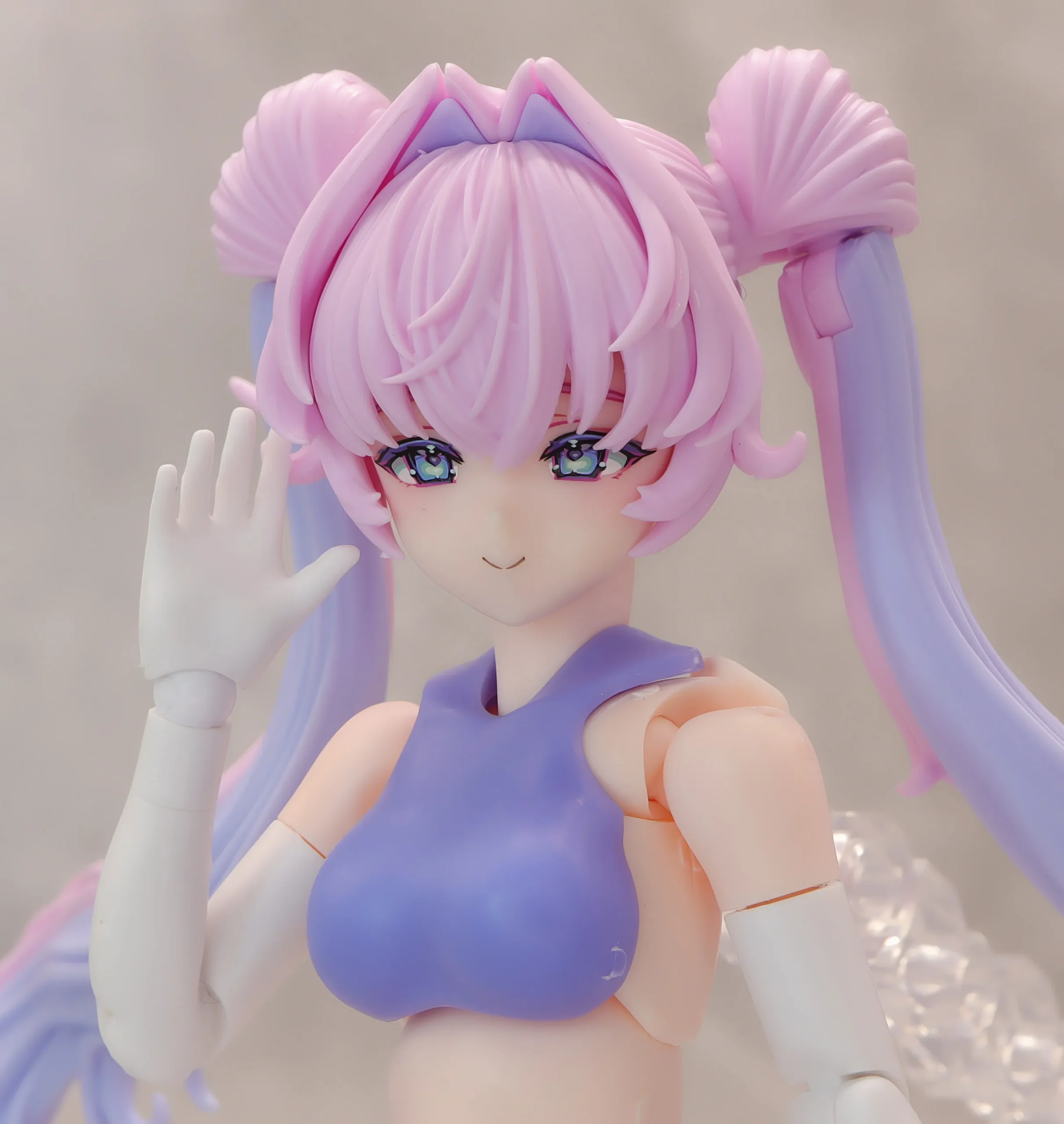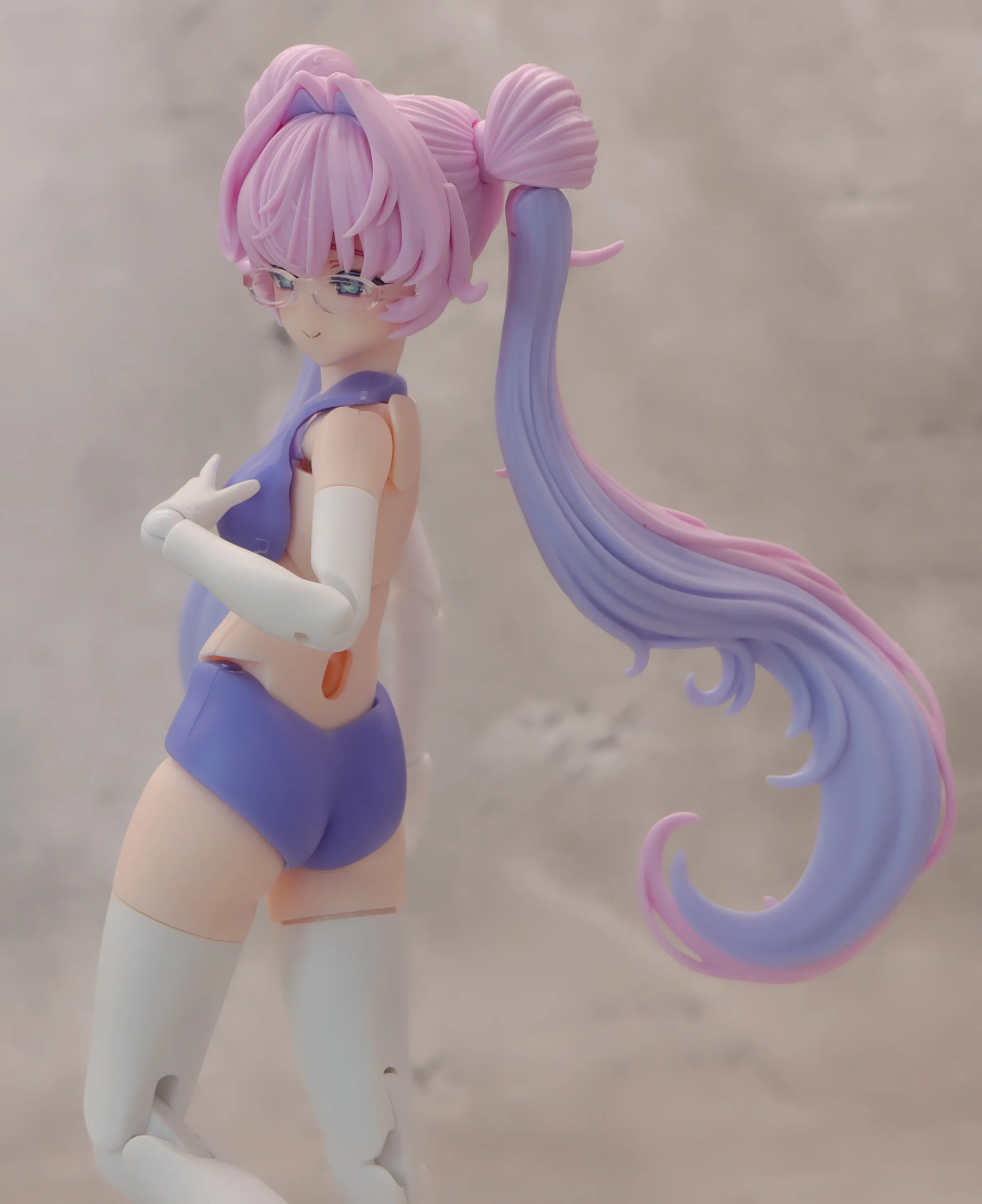 ツインテールの髪型だと背中のウイングユニットに髪の毛が干渉するので、リング編みのパーツの方がアクションの幅は大きい気がしますね
