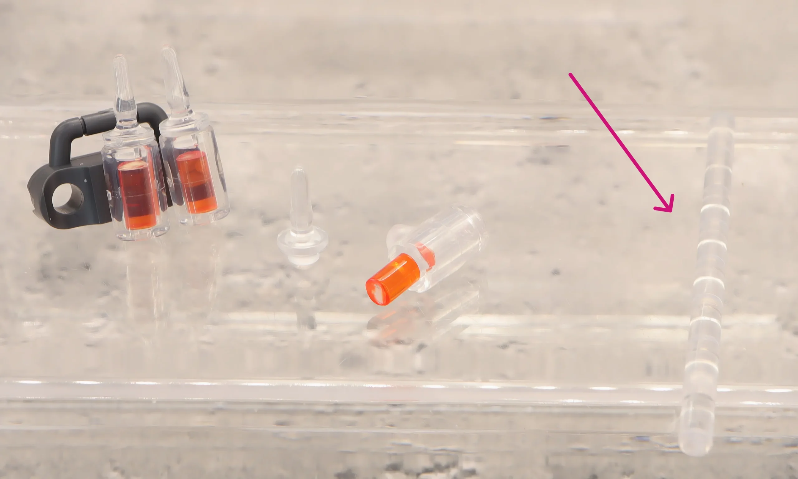 アンプル弾の中身は右のような節目が付いたオレンジ色の3mm棒を切り離して作るのですが、無職透明の物も付いているので色々な色で塗ればお好みのアンプル弾を作ることも可能です。(各種クリアカラーの3mm棒を持っていればそれを切り分けて作るのも良いかも・・)