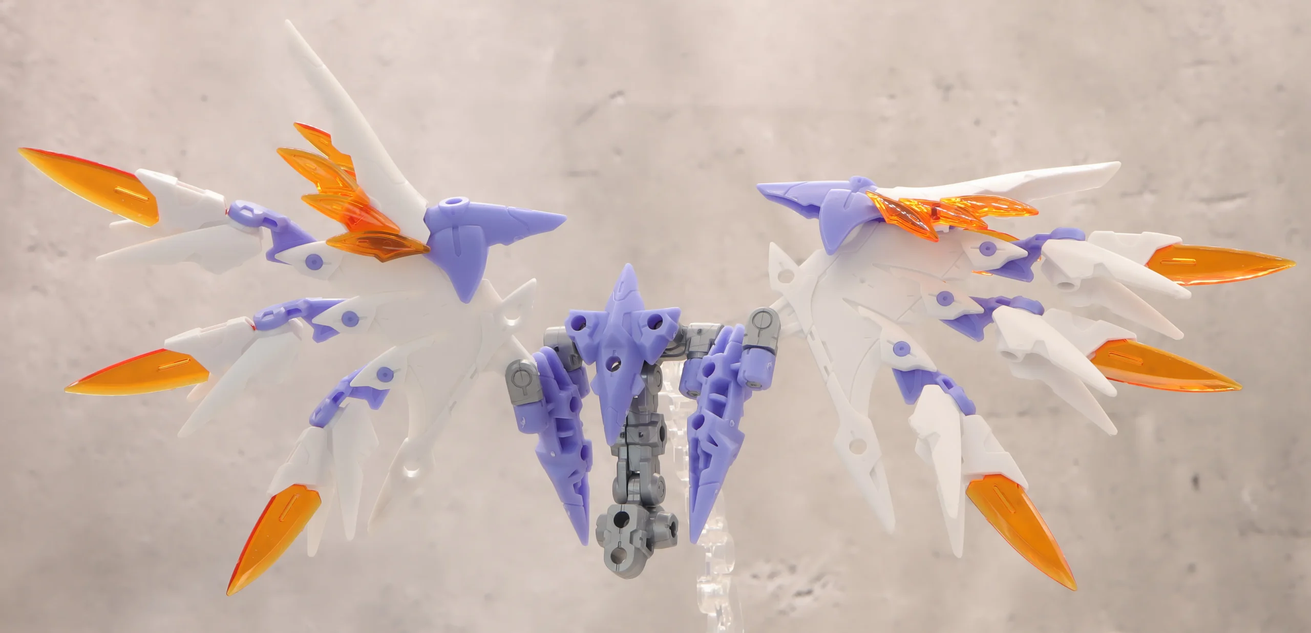 ボリュームのある大きな羽とオレンジのクリアパーツのおかげで凄く派手な見た目になります。