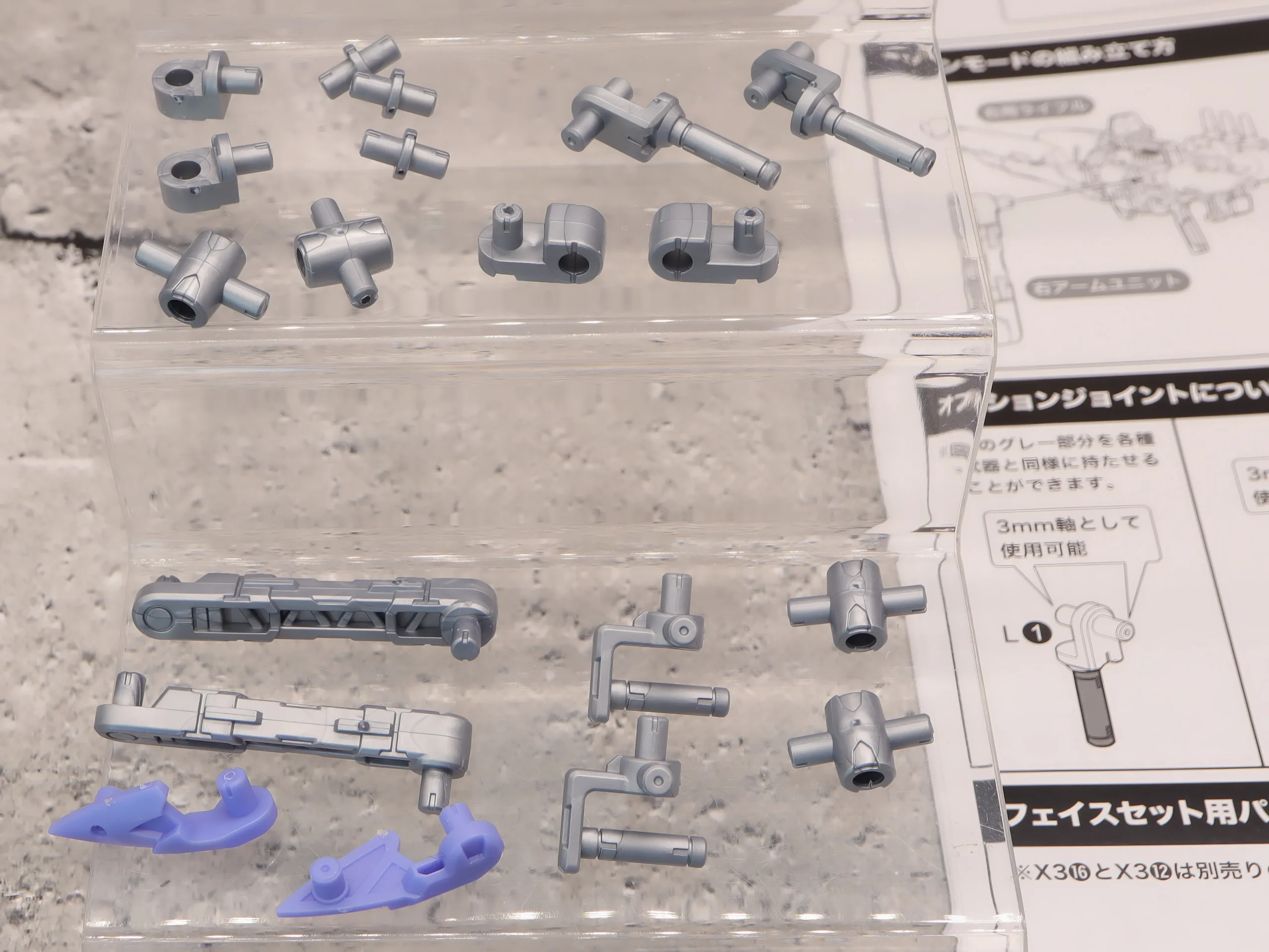 腕や足などに付けるリングパーツは3mm穴と3mm軸の2種が各部用意されているので、カスタマイズ派にも優しい仕様
