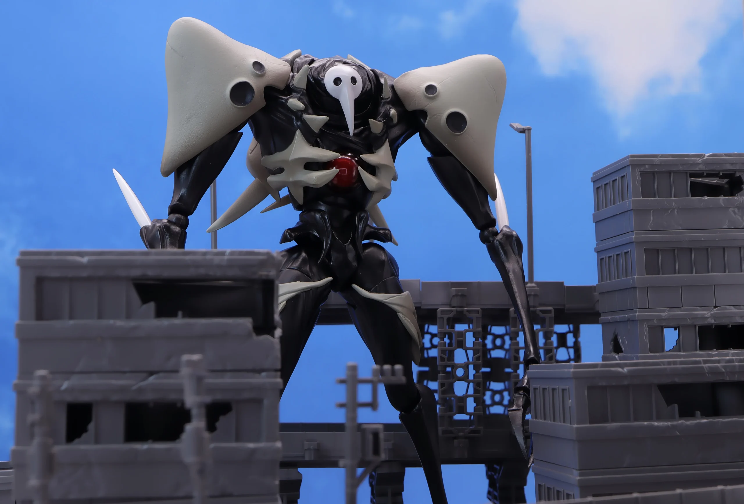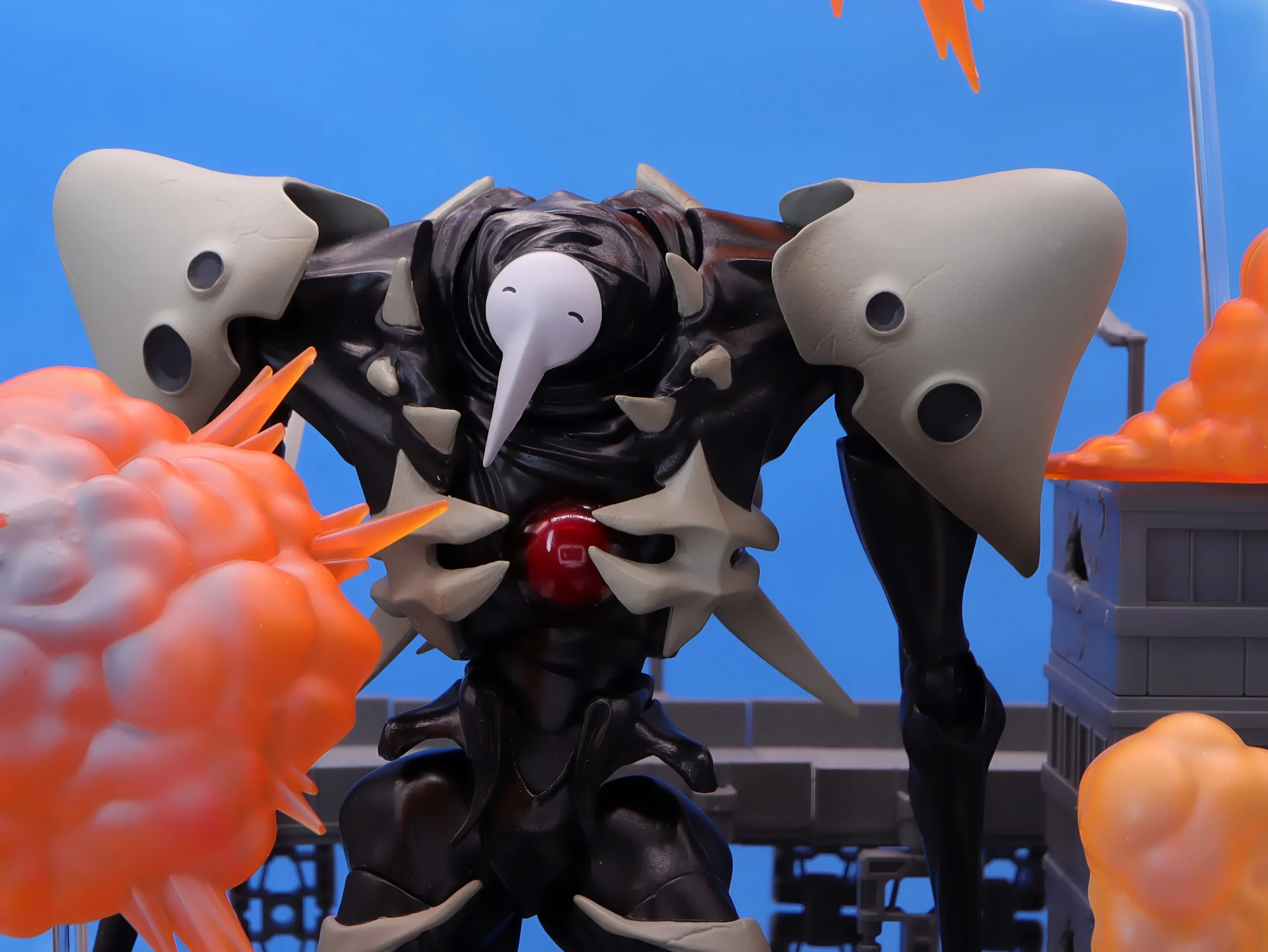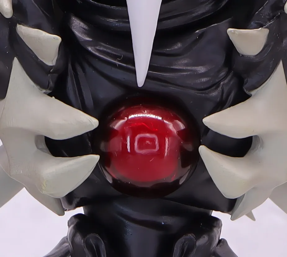 各部の外骨格は汚し塗装やツヤ消し塗装が入っていて骨のような材質感、写真だと伝わりにくいかもしれませんが、胸のコアはクリアパーツ製に特別な部分である感じが際立ってます。