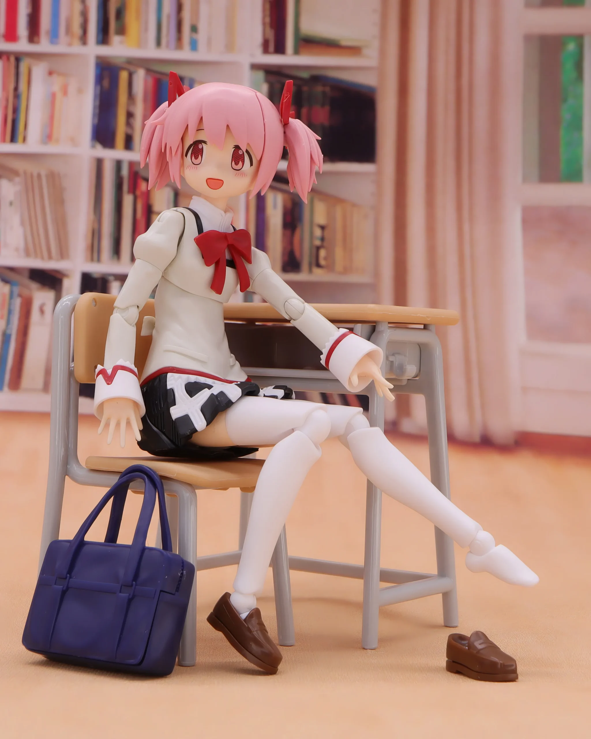 ちなみに原作の見滝原中学は電子黒板とかガラス張りの校舎とかで、かなりハイセンスで近代的な学校になっています。机もこんな感じの一般的な物ではなく、どう座るのコレ?って感じの形の机と椅子です。